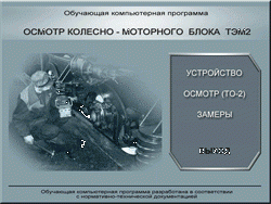 Обучающая компьютерная программа «Осмотр колёсно-моторного блока тепловоза ТЭМ2″ служит для повышения уровня знаний специалистов ПТОлов локомотивных депо, занимающихся техническим обслуживанием ТО-2 маневрового тепловоза ТЭМ2; а так же для самоподготовки к экзамену и для проверки теоретических знаний.