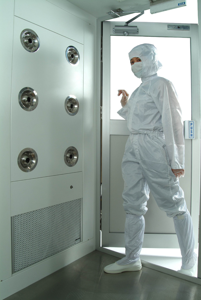 - По умолчанию входная дверь в шлюз разблокирована, дверь из шлюза в чистое помещение заблокирована. Когда оператор заходит в шлюз, входная дверь в шлюз блокируется, начинается цикл очистки. По окончании цикла с двери из шлюза в чистое помещение блокировка снимается, оператор выходит в чистое помещение, дверь за ним запирается, и входная дверь в шлюз снова разблокирована.